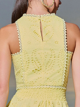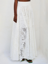 The sculpted crop top features a modest high crew neckline—clean, crisp, and tailored—while the long, flowy skirt brings the drama. It’s the kind of eyelet dress you reach for when you want to look effortlessly polished.