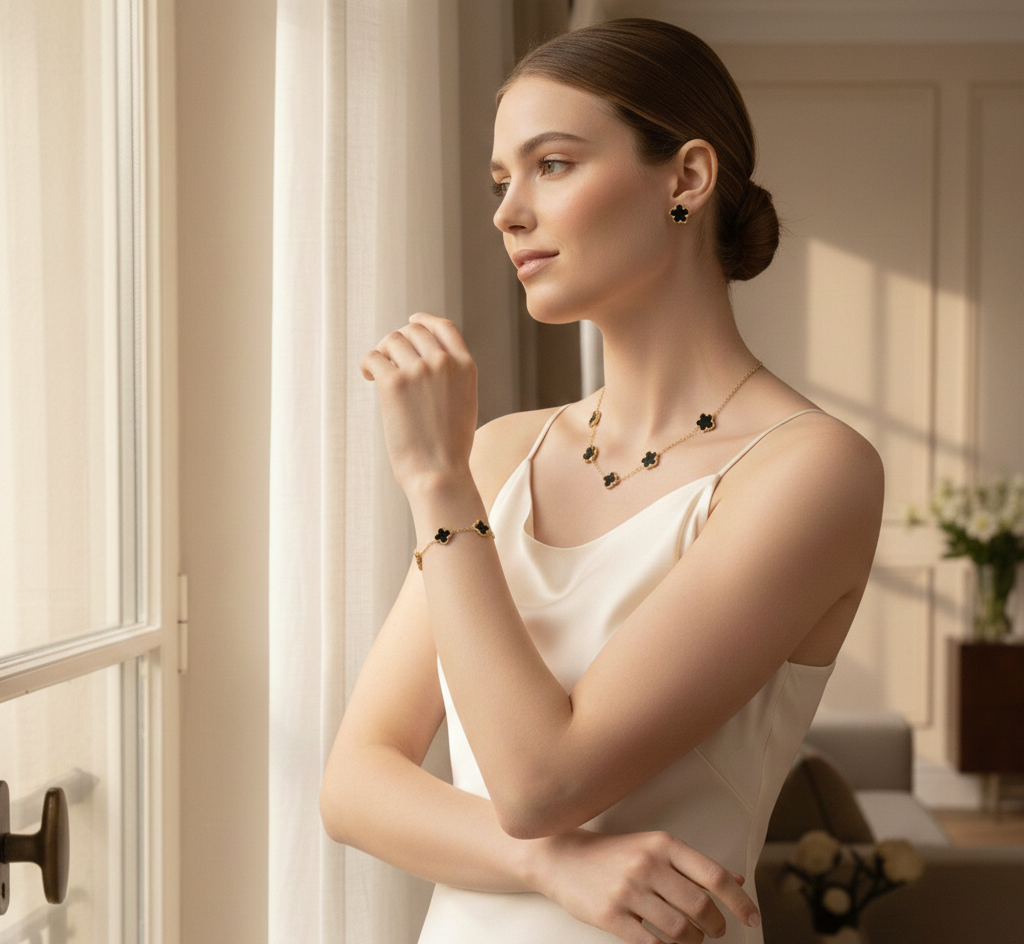 Clover motif design – Floral clover charms create a recognizable luxury-inspired jewelry set that elevates simple outfits instantly.
