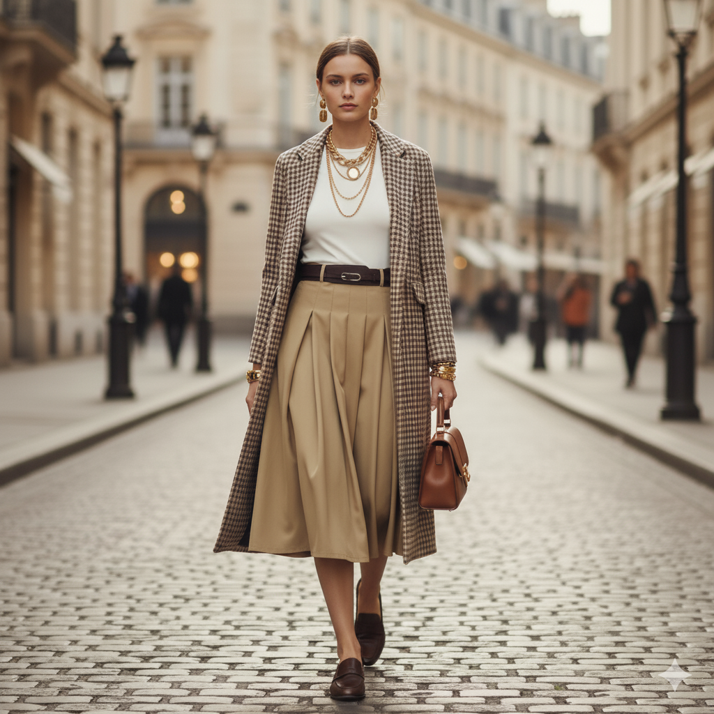 • Elegant pleated skirt – the pleats move beautifully, giving statement-style drama while fitting into business casual midi outfit zones.