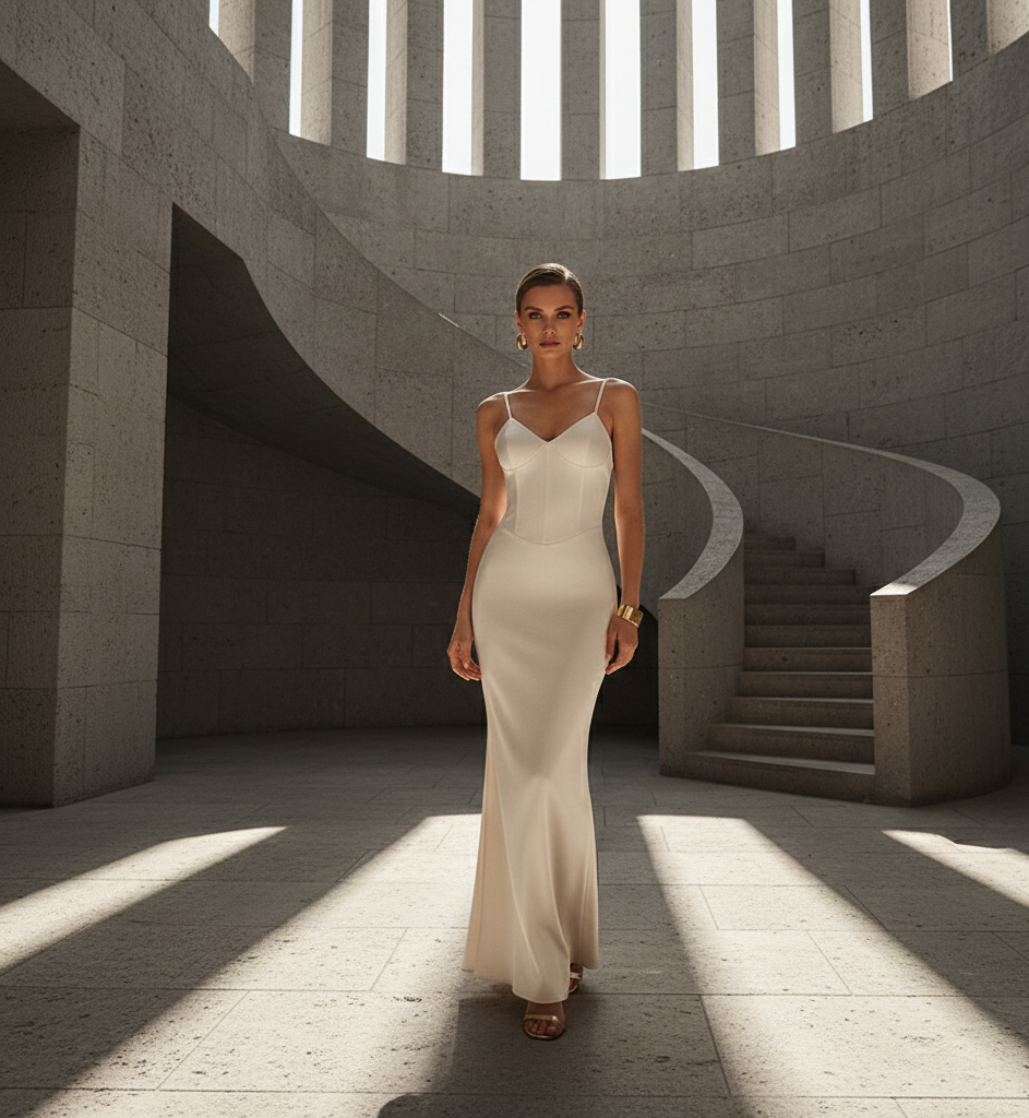 Corset Satin Maxi Dress energy, but elevated into a luminous champagne maxi dress moment that whispers quiet luxury gown instead of shouting trend. This sculpted, column-skimming silhouette with a corset top finish, spaghetti strap column dress and a soft sweetheart neck plunge corset seams A line flow dress cut gives real main-character confidence.
