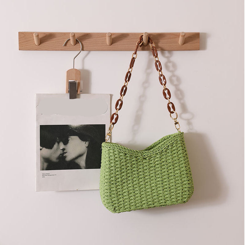 • Resin chain strap – Glossy links add contrast and modern polish, turning this natural straw handbag into a statement casual summer purse.