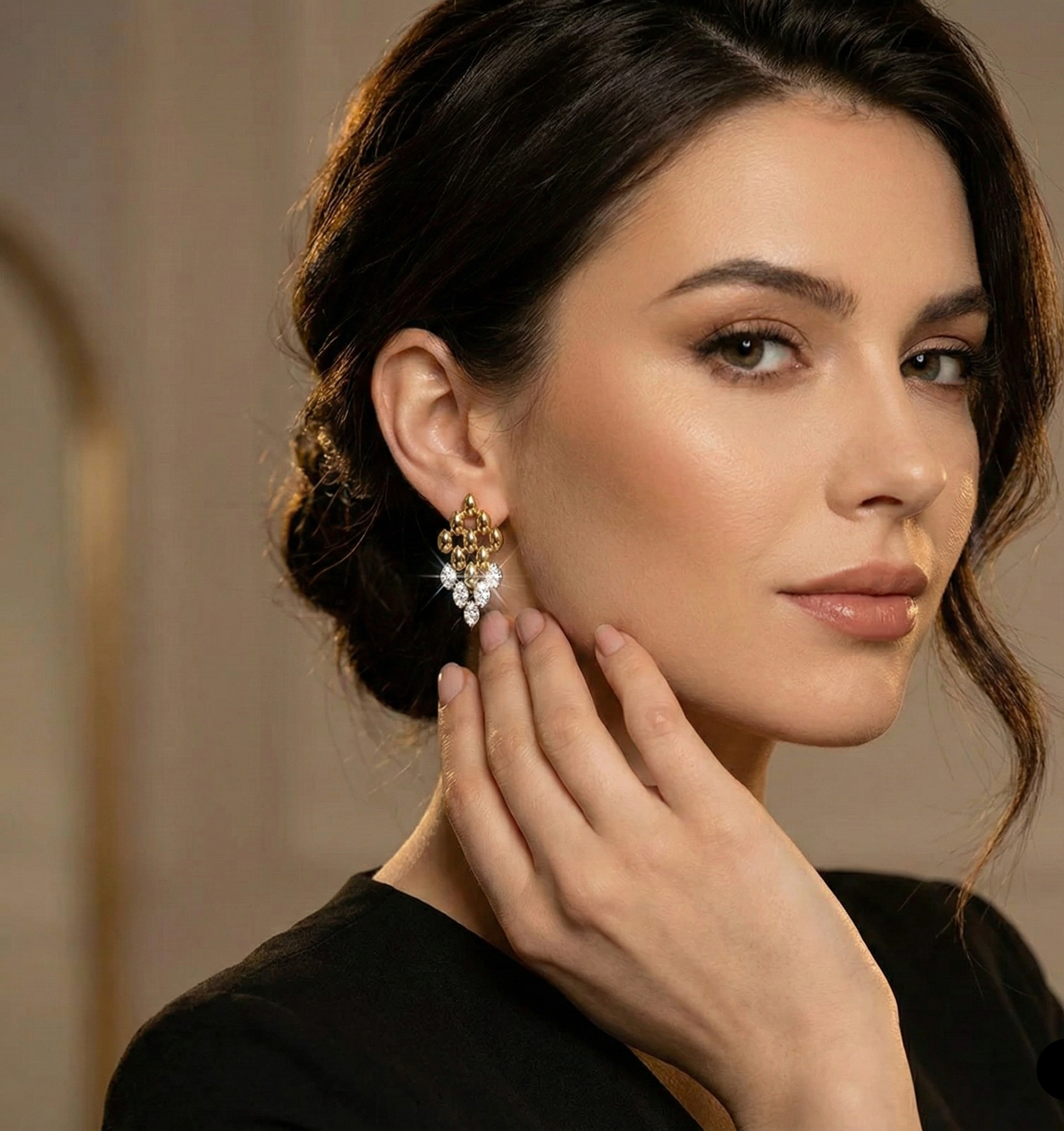 These aren’t “cute little studs.” These are gold geometric drop earrings that move when you move sharp rhombus lines, crystal sparkle, and that clean-luxury energy that instantly upgrades everything. Think statement earrings for women who like their style bold, polished, and a little intimidating (in the best way).