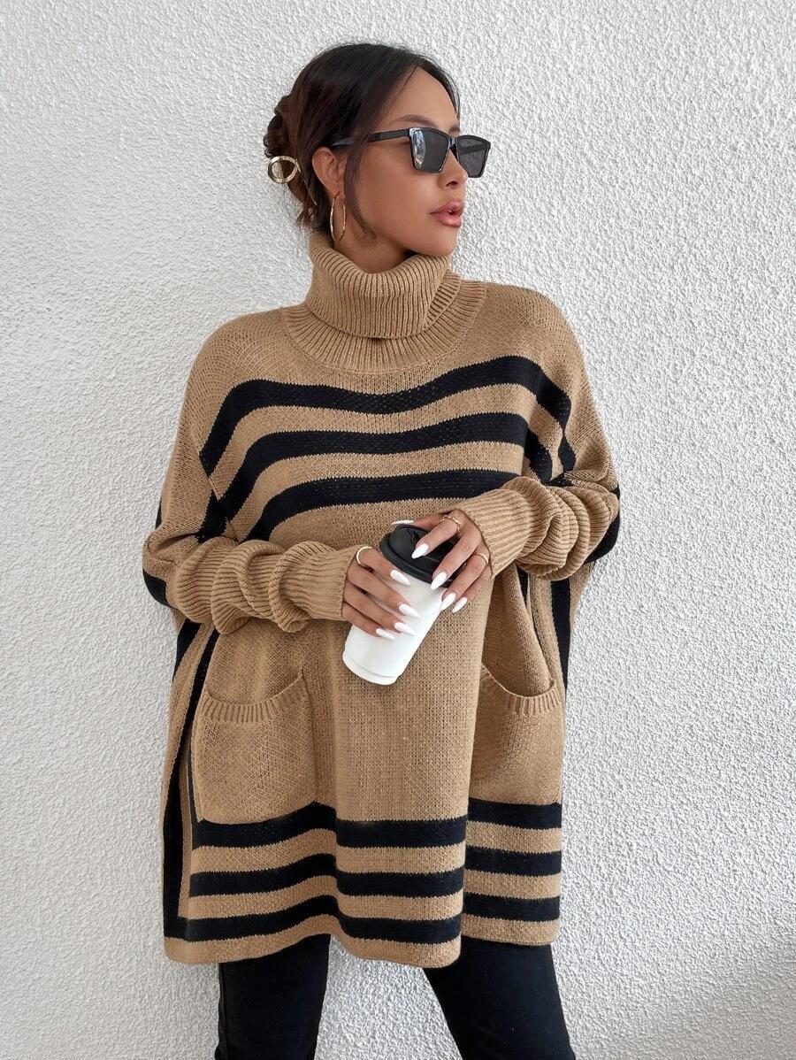 Summary: A camel oversized turtleneck sweater for women with geometric stripes, batwing sleeves, and a poncho-style fit. Perfect for fall layering, travel, and cozy winter outfits. Ideal for searches like camel oversized turtleneck sweater with stripes women and geometric stripe poncho turtleneck for women.