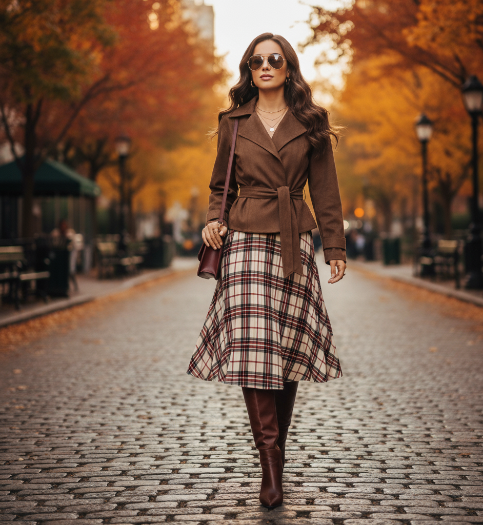 Summary: A coffee brown plaid A-line midi skirt with belt that’s chic, versatile, and SEO-optimized for office wear, fall outfits, brunch styling, and capsule wardrobes. Perfect for women looking for flattering midi skirts with buckle detail that transition from work to weekend with ease.