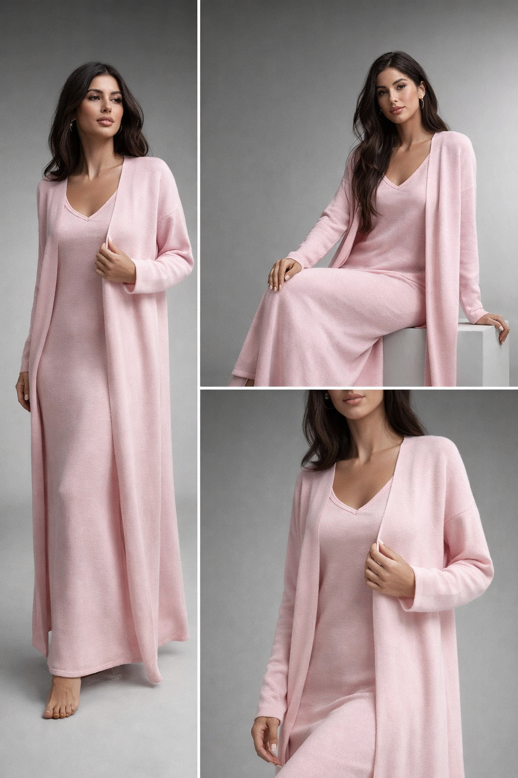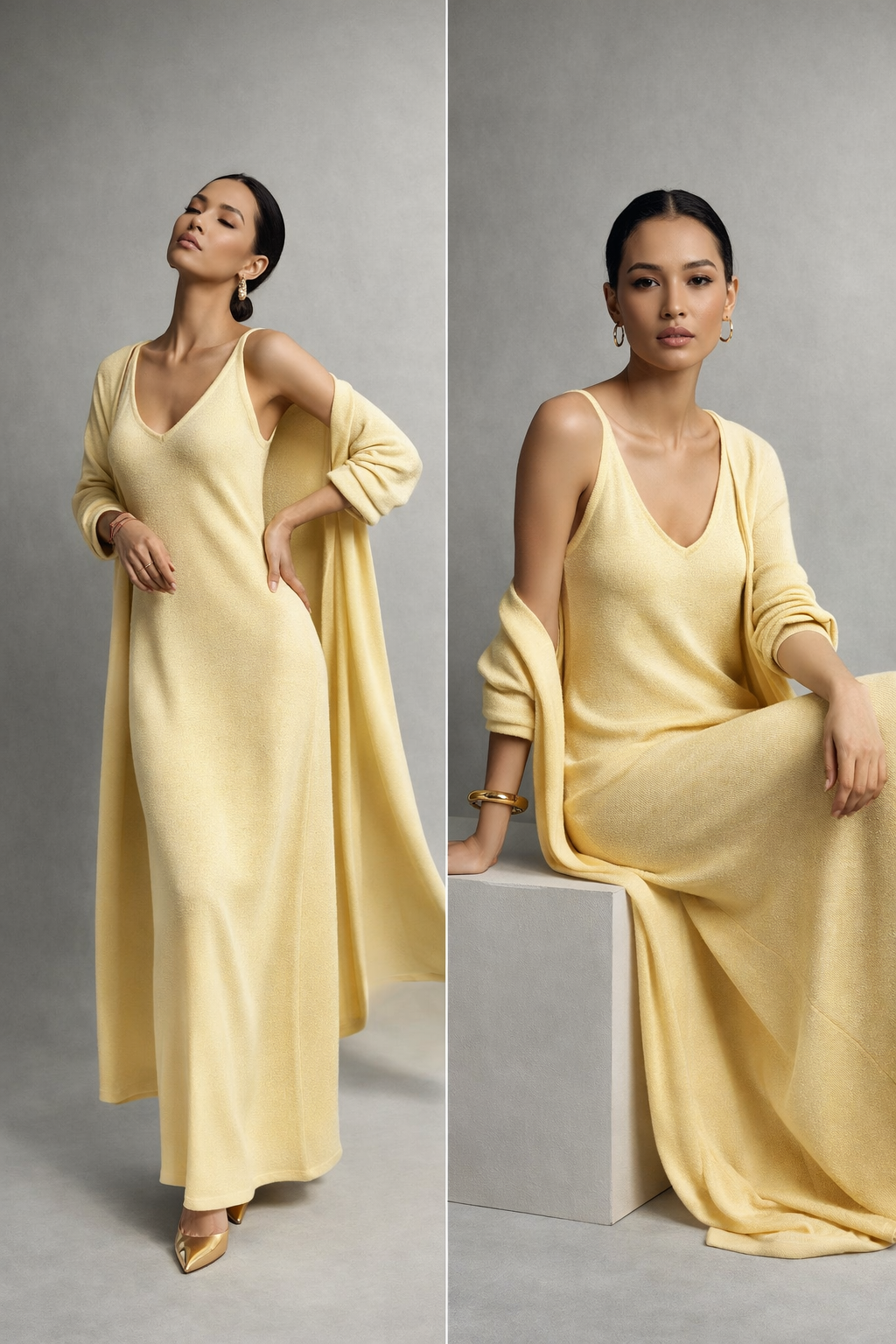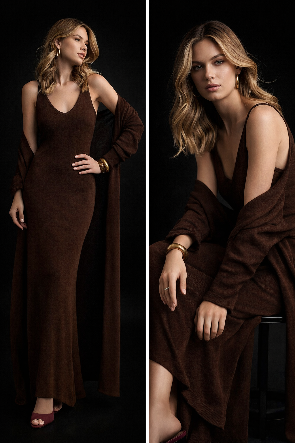 Knit maxi dress and cardigan set energy for women who want polish without the performance. This soft, body-skimming co-ord set pairs a sleeveless knit maxi with a long, fluid layer for that effortless quiet luxury outfit mood.