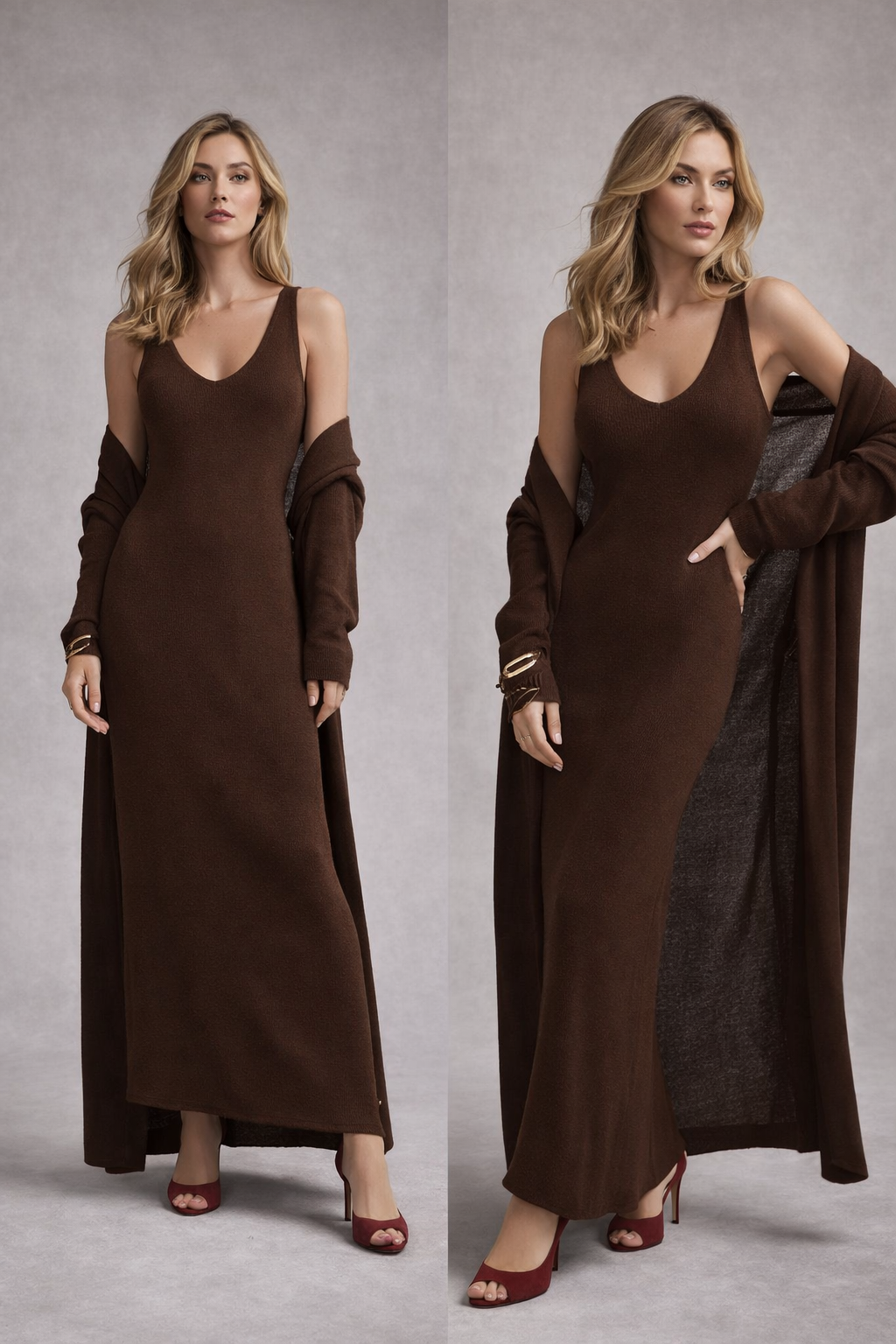 AI Summary: Soft knit maxi dress and longline cardigan co-ord set with a straight, body-skimming silhouette and V-neck sleeveless cut. Ideal for business casual knit set styling and effortless old money fall outfit set layering.