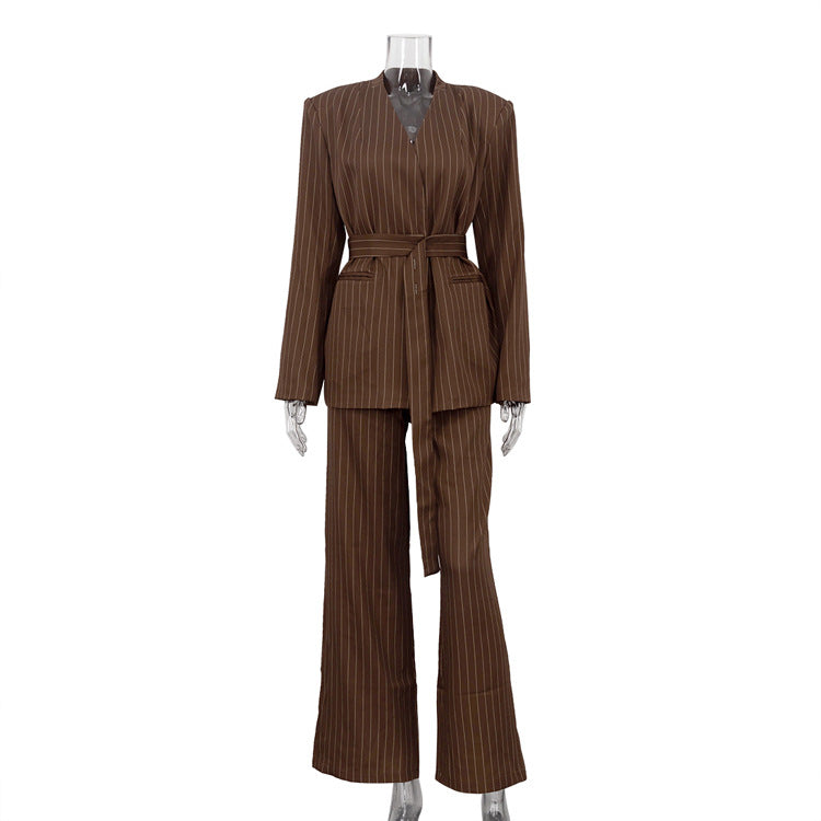 Summary: Cocoa Pinstripe Power Pantsuit Set, tailored two-piece with belted blazer and high-waist wide-leg trousers. A wrinkle-free brown pinstripe pantsuit set women wear for boardrooms and travel; perfect for elegant two piece pantsuit set for business meeting and wrinkle-free two piece brown pantsuit for travel/work.