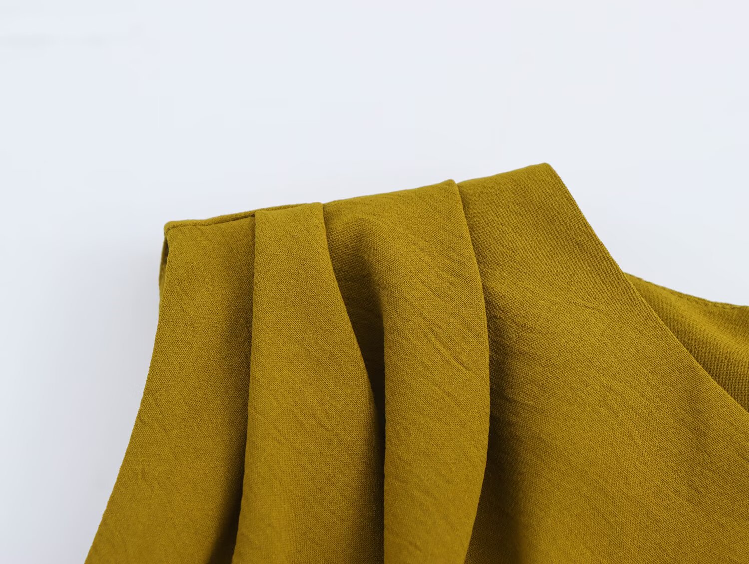 Summary: Mustard-gold draped midi dress with asymmetric pleating and metallic ring waist detail. A refined statement piece perfect for cocktail dresses, work-to-evening looks, and travel wardrobe essentials.