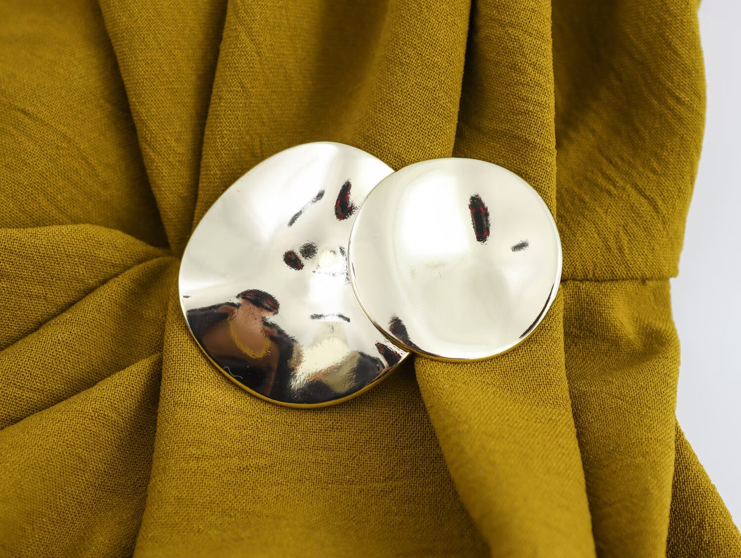 Slip into this golden mustard midi dress and boom you’re glowing. With a luxe draped silhouette and a metallic ring detail that cinches your waist.